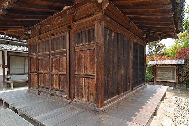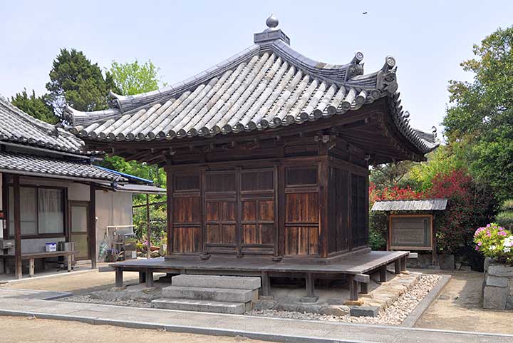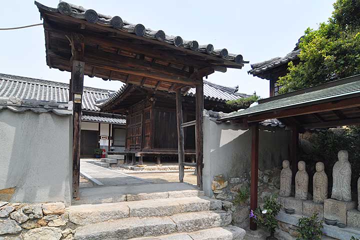 弓削島の高台にある寺院の小さな観音堂。現地の案内板によると飛弾の工匠によると推測されるという。1980年に解体修理完了といい、目で見た範囲では瓦(もちろん本瓦である)は多くが新しいものに交換されているようだが、室町時代の創建時の木材や瓦も残っているようだ。それほど細かな細工は見られないが、アクセントになっているのは正面の桟唐戸で、禅宗様の特徴をよく表している。