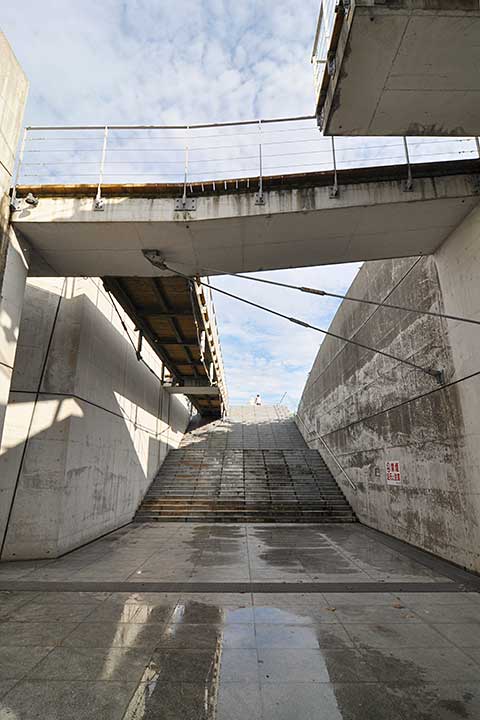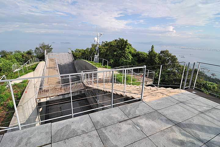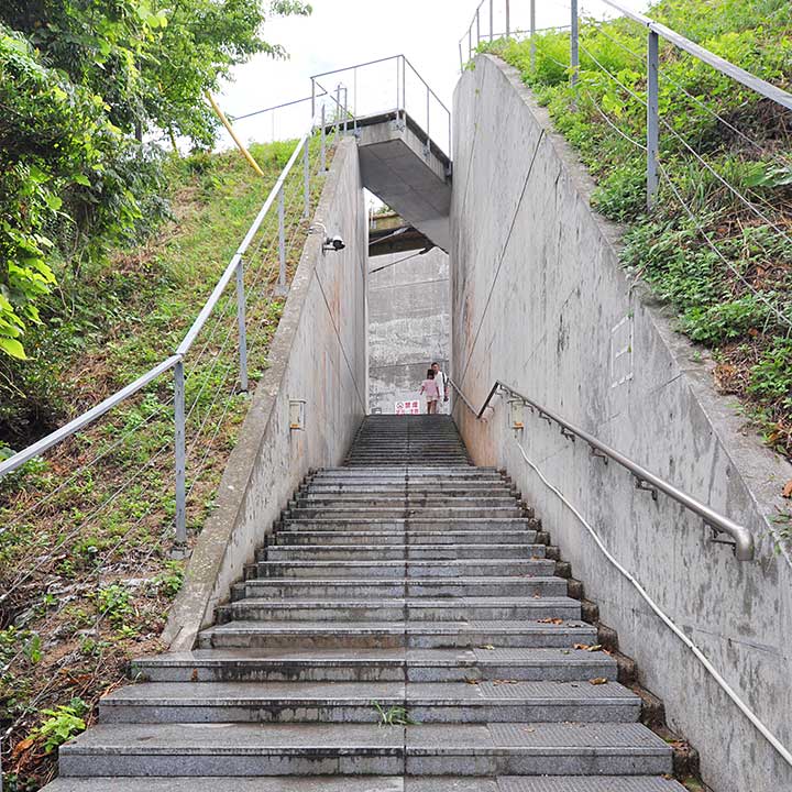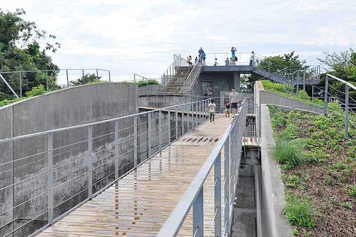 施設の平面形は、山頂に開けられた(正確に言うとここを残して周囲を土盛りしたのだが)スリットの両端に展望スペースが設けられ、それらは薄いブリッジで連絡される。そしてアプローチはスリットの側面からもう一本スリットが分岐する形になっている。展望台からの眺望はすばらしく、瀬戸内海全体を見てもトップクラスの絶景である。