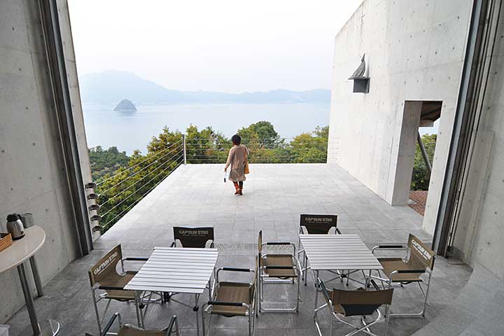 海に向かう斜面地に建つ美術館。平行する2枚の壁を建て、その上に屋根を載せただけのシンプルな建築だ。展示室は地形に合わせて細かく6つの段を刻んでおり、壁の外側に階段が貼り付いている。壁同士の間隔は6m、長さは40m、エントランスと最下階のテラスとのレベル差は6mで、横から見ると「登り窯」のようにも見える。テラスからの瀬戸内海の眺望はとても気持ちいい。