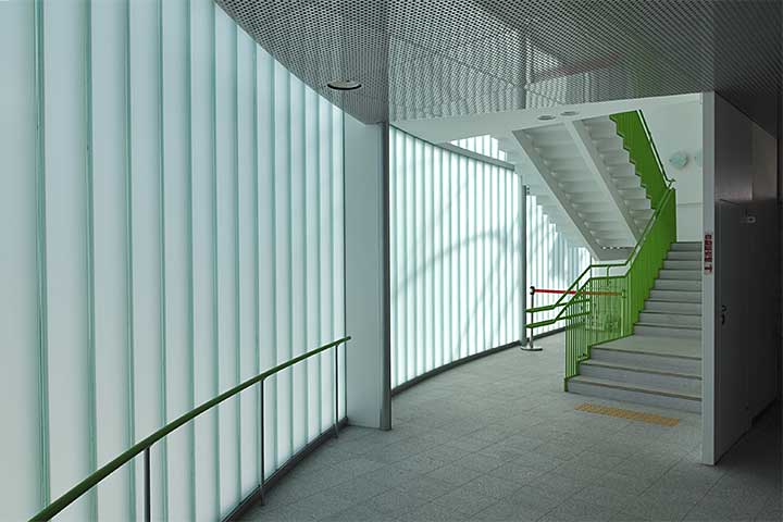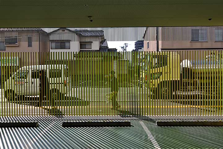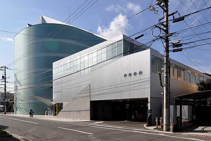 建物の構成は、大まかに言って、北側ボリュームが児童館で南側が福祉センターとなっており、比較的交通量の少ない東側道路沿いにメインエントランスが配置されている。南側立面は東側とは違い、メタリックなルーバーで覆われた直線的なデザインとなっている。あのルーバーにどれほどの効果があるのかは興味のあるところだ。