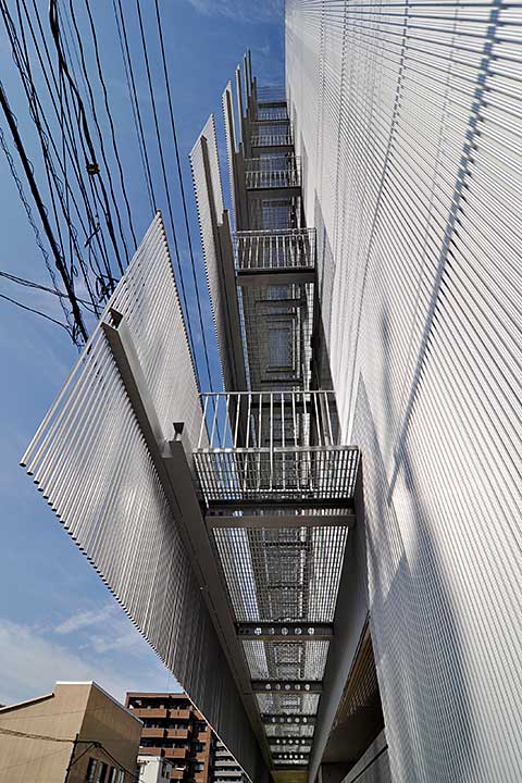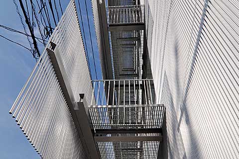 要求された床面積は、ほぼ許容限界に達するため、道路斜線制限と北側の日影規制から全体の形態を決定せざるを得なかった。 -(中略)- 上層の北側は日影規制の範囲内で最大限の床面積を確保するため、曲面を採用している。3階の北側コーナーにあるふたつの曲面もまた、日影規制による。