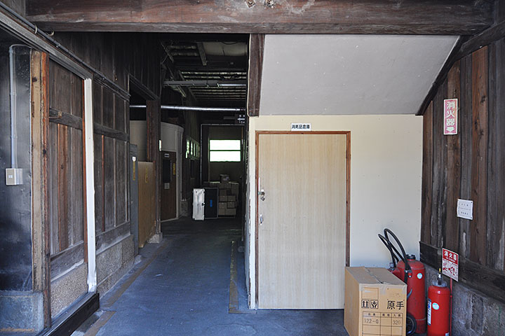 会社のご厚意で少しだけ内部も見せてもらえた。築100年の木造であるが、ほとんど狂いもなく現役で使われているとは驚きだ。構造がかなり強靱に作られていたのと、それほど重量物を乗せなかったためだと思われる。かなりの大スパンなので、ひょっとしたら鉄トラスを使っているのかもしれない。