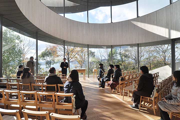 瀬戸内海を一望できるベラビスタ境ガ浜の敷地内に建つ結婚式用のチャペル。造船会社の接待所を起源とするホテルの新事業の目玉として建設された。