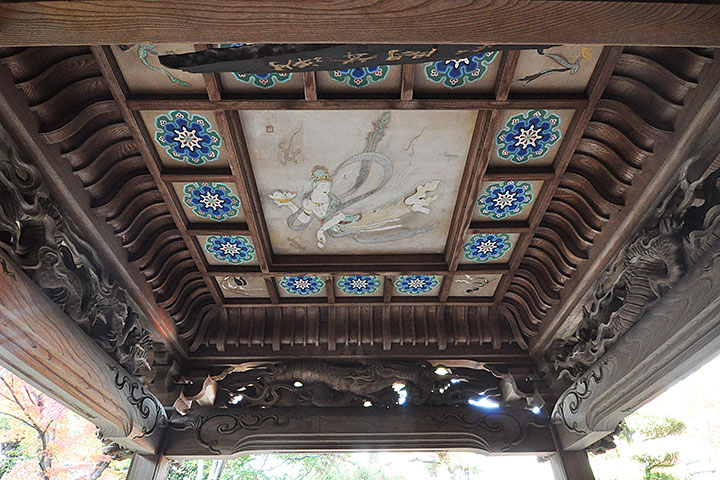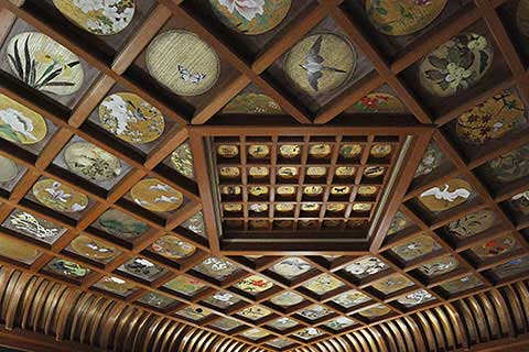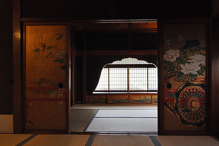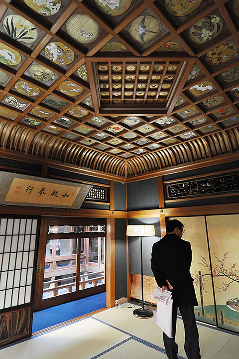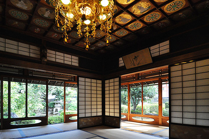 配置計画を見ると、洋館(応接室など)と書院造の和館(生活の場)が前面道路に平行に並んでおり、同時期の邸宅としては一般的なスタイル。見学は和館裏側の勝手口から入る(写真#14)ので、唐破風が付いた正面玄関は室内側からしか鑑賞できないが、屋外だというのに天井は折上格天井(しかも絵入り)というのに驚かされる。(写真#4)。