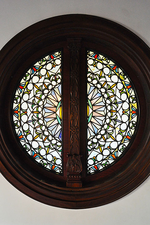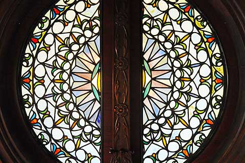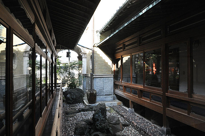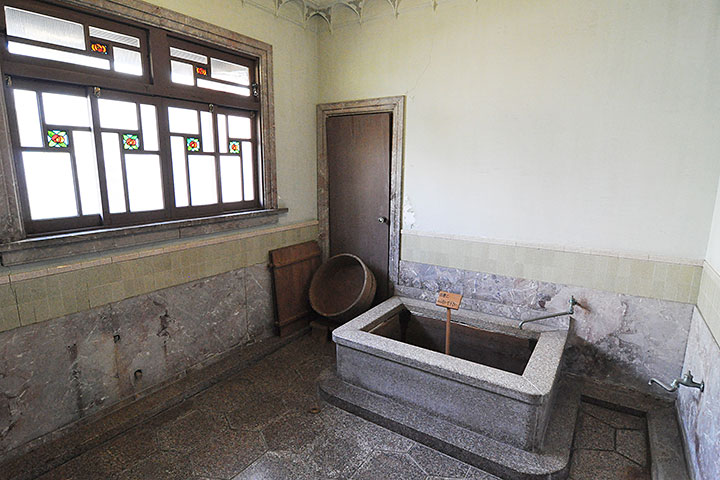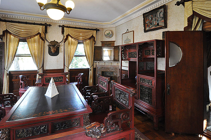 諸室のグレード設定も興味深い。日本家屋は伝統的に応接を最重視するが、本作では和館の応接室よりも居室(老人室と称す)の方が明らかに上で、「母親のための家」ということがよく分かる。この老人室は用材・装飾ともに最上級グレードで、折上格天井にはめ込まれた絵は一流の絵師によるものとされ、まさに贅を尽くした空間となっている。洋館の応接室は中国清朝期の調度品で整えられ、床は寄木のフローリング(写真#10)。浴室の丸いステンドグラスも素晴らしい。(写真#13)