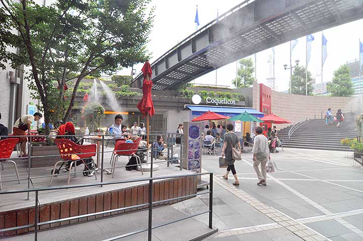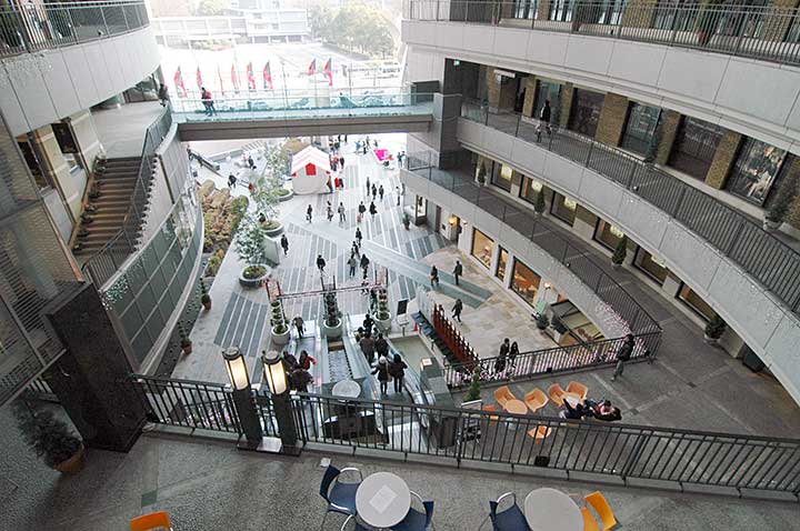 また、舗装材から各種サイン、さりげなく置かれたベンチに至るまで意識して高級感・グレード感を演出している点も見逃せない。ディテールが安っぽいと建築意匠が巧みでも全体として良い結果にはならず、設計段階において施設や来街者のイメージを設計者と商業プランナーとクライアントの間で共有できたのだろう。バブル期の計画だったとはいえ、昨今の商業施設のあまりに貧相な仕上がりとは一線を画している。サインデザインやアストラムラインとの接続など、複合開発にしてはうまく解かれていると感じる。