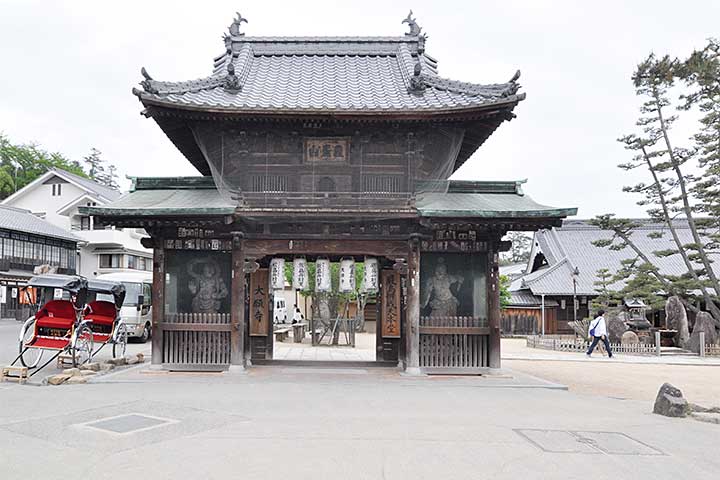 #1:山門 厳島神社に接して建つ古刹。江戸時代は各地の寺社の普請役を務める有力寺院であり、神仏習合の中で厳島神社とも密接な関係にあった。 現在は本堂や山門などが残る程度であるが、かつては千畳閣までが広く境内であったという。
