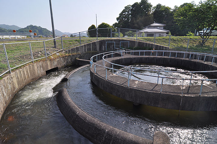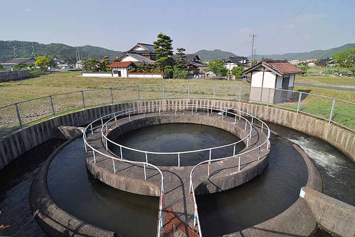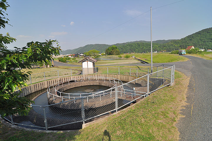 吉田町の外れ、国道54号から少し入ったところにある円筒分水。円筒分水とは農業用水を地域で分けるための装置で、引いてきた水を円筒の中心部から溢れさせ、その溢れた水を分ける仕組みになっている。円周のどこに仕切りを入れるかによって、意図通りの比率に、公平に水を分けることができる。同様のものは全国各地に点在しているが、広島県内では今のところ本作を含めて2箇所確認している。