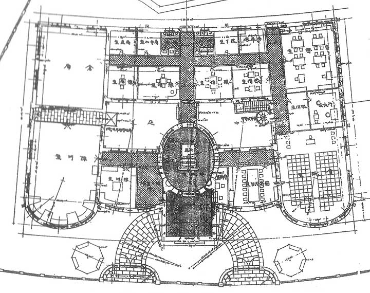 #6:旧産業奨励館の平面図。中央のドーム部分は階段室で楕円形。川側ファサードも平坦ではなく楕円。さらに建物全体が川のラインに沿って曲がっている点にも注目したい。(CC対象外)