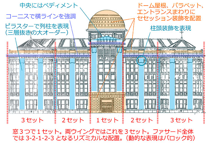この平面形を踏まえつつ、杉本俊多先生の論文(参考文献6))を参考に立面を解説する。まずファサードの窓を見ると、3つ単位で1セットを構成しており、左右のウイング部に3セット、中央のエントランス部に1セット、両者の間に2セット配される。左右対称で3-2-1-2-3というリズミカルで動的なバロック的な配置といえる。セットの区切りになるのはピラスター(付柱)で、これを列柱に見立てている。しかも1~3階までぶち抜きのジャイアントオーダーで、バロックの特徴が出ている。また、ドーム屋根直下にはさりげなくペディメント風な造形が置かれている。このように基本的にはネオ・バロックだが、ドーム屋根、パラペット、エントランス周りといったポイントにはアクセントとしてセセッション風の装飾が付けられている。