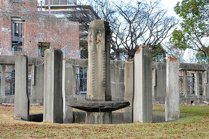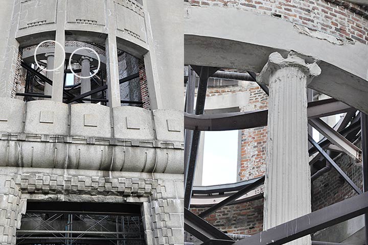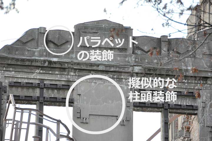 レンガとRCが併用されているが、開口部が大きく、耐震性には問題があったと思われ、RC造であるレストハウスや日銀とは異なり被爆時にほぼ崩壊した(*2)。辛うじて残っているのは爆風がほぼ直上から襲ってきたためであろう。戦後はたびたび取り壊しの危機に瀕しつつも生き延びた。鉄骨により支えられ、樹脂を注入されることで全面崩壊を免れているが、依然として地震等により倒壊してもおかしくない状況にある。
