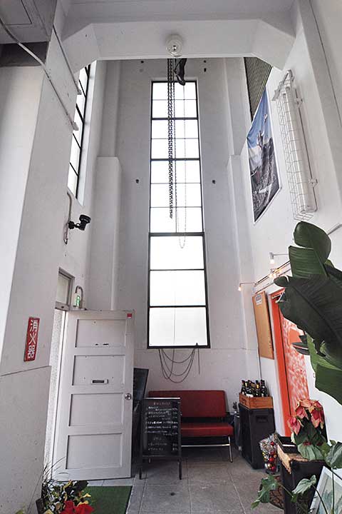 エントランスをくぐると機器搬入用の滑車とハッチが見られる。機械を搬入する時は、前面道路から入れて、滑車で持ち上げ、二階レベルのハッチからさらに内部に入れるという設計のようだ。