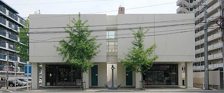 #1:外観 #2:中庭空間 広島港近くに位置する商業施設。正面から見て手前の部分は1階:船具店、2階:雑貨店。後方には救命いかだの整備工場、さらにオーナーの住居が配置されている。 建築計画上の特徴は中庭空間。真ん中の階段を上がると水盤を備えた中庭空間に出る(写真#2)。この規模の建物にこれだけの「遊びの空間」を設けるのは、普通の企業ではまずありえない。理解ある施主がいてくれたからこそ実現したのだろう。