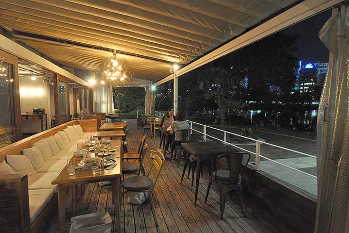 さて、ここの強みはやはり河岸緑地に直接繋がっていることだ。広島市はこのホテル周辺を含む京橋川岸一帯において河岸緑地(河川区域)における営利事業としてのオープンカフェ経営を認めている。インターロッキングをやめてウッドデッキにし統一感を出すと更に良くなると思う。
