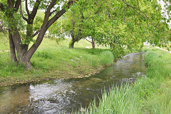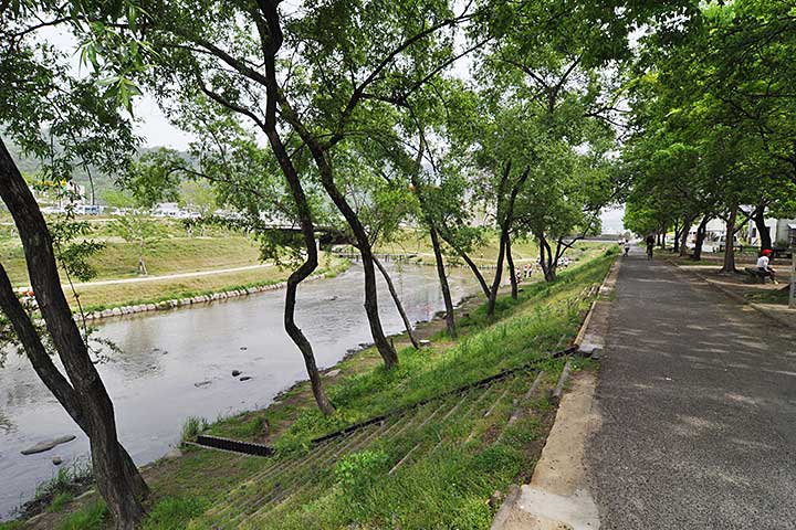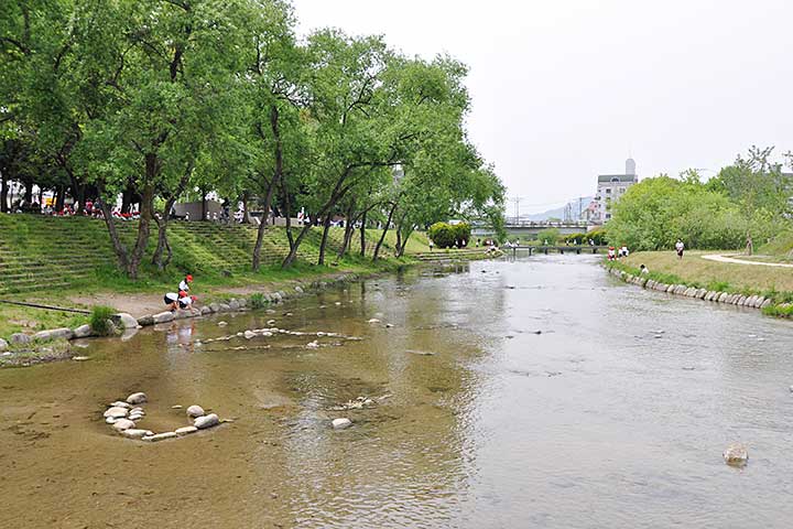 広島湾に注ぐ太田川の支流、古川の一部が河川公園として整備されている。基町と共に、自然を感じさせる護岸の先駆けとなった事例である。従前の樹木やせせらぎの形状を活かしながらデザインされており、あまり有名ではないが間違いなく名作だ。