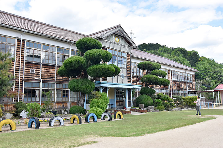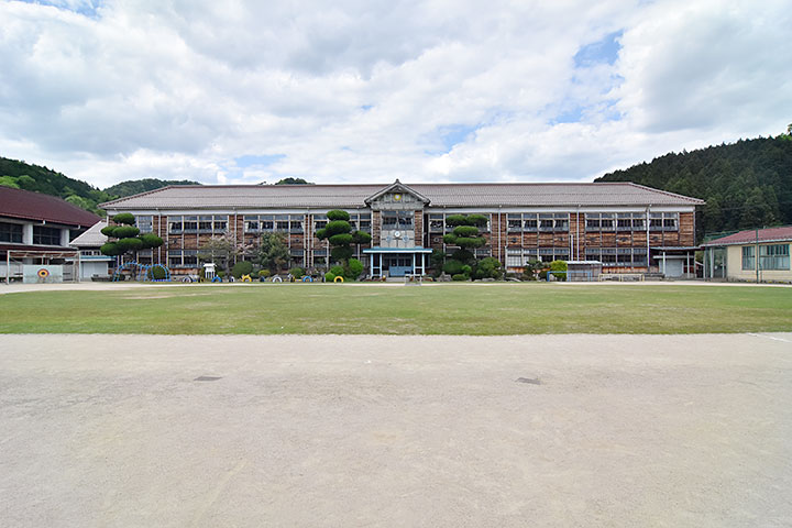 吉田を流れる江の川近くに建つ小学校。戦国大名毛利氏の本拠地として知られる吉田は古くからの荘園であり、周囲には今なお豊かな田園が広がっている。