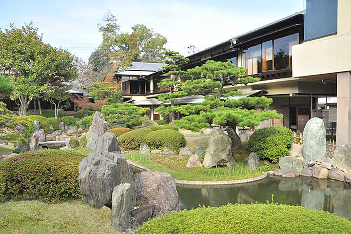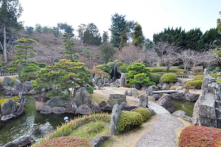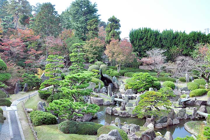 広島デルタの南端部、仁保・本浦で果樹園を経営していた金井半(かないなかば)は、敷地内にツツジを植えることを思い立ち、1936年に「金井公園」をオープンさせた。その後、広島遊園地、半兵衛庭園と名称を変えつつ、ツツジの名所として定着し、現在は庭園のほか料亭・温浴施設として知られている。 建築ファンとしては重森三玲(しげもりみれい・1896-1975)作庭の「聚花山(しゅうかざん)の庭」をぜひ押さえておきたい。