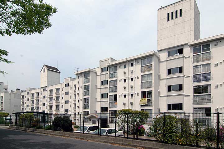 #1:右端が1号棟。浴室が手前に増築されファサードに凹凸が付いている。