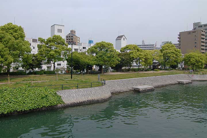 京橋川に面した市営住宅。復興の足取りもおぼつかない昭和24年に出現したRC(鉄筋コンクリート)造の集合住宅であり、竣工当初は大きな注目を集めた。「平和アパート」というネーミングにも時代が現れている。詩人 峠三吉(1917-1953)もこのアパートの住人で、「河のある風景」という詩は部屋から眺めた京橋川を詠んだものとされている。