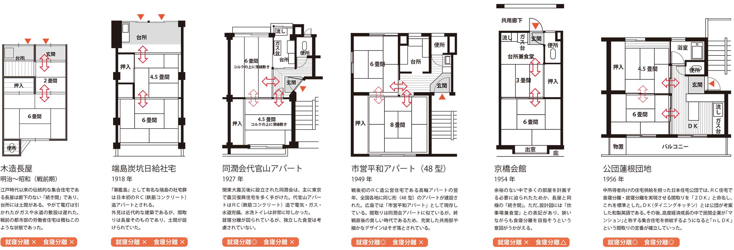 #3:平和アパート1号棟の間取り。標準設計51型出現前なのでダイニングキッチンはまだなく、居室で食事と就寝の両方を行う。