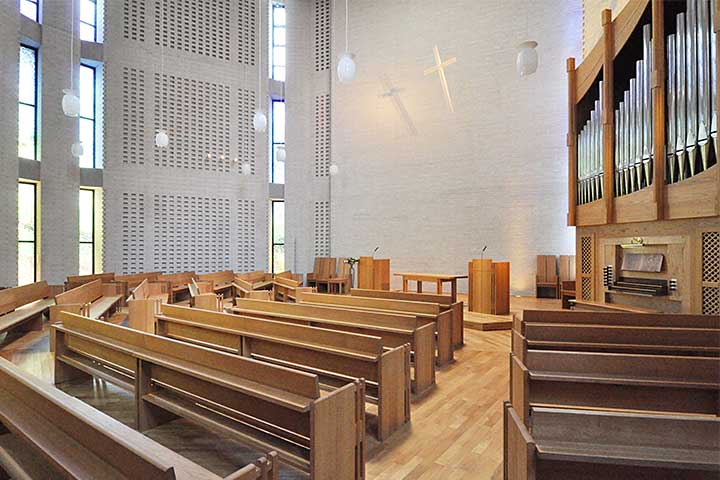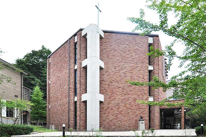 牛田の山の中に広がる大学キャンパスに建つチャペル。女子大ということもあり普段は入りにくい施設だが、見学の機会を得ることができたのでレポートしたい。