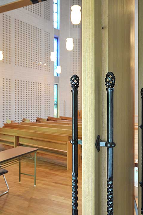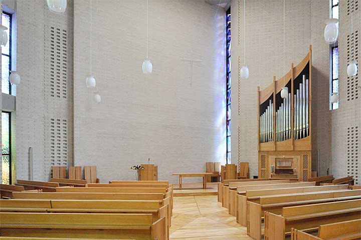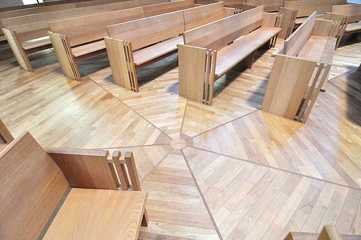 本作の計画上の特徴は七角形の平面プランであることだろう。資料によると「聖書では七は完全、多数、統合をあらわす数として多く用いられています」とあり、敷地条件も勘案してこの形に決まったようだ。特にカトリックの聖堂は十字の平面形が原則でタテヨコがしっかりしているものだが、このような左右非対称な形というのも面白い。