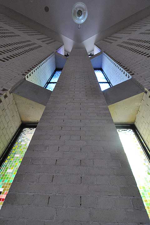 青のステンドグラスも特徴の一つ。七角形の各頂点にスリットが設けられ、そこにステンドグラスがはめこまれている。青色は水の表現のようだ。