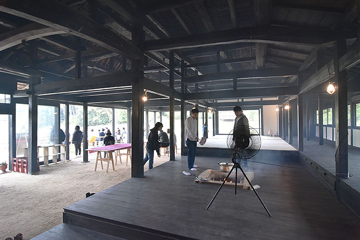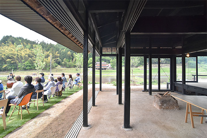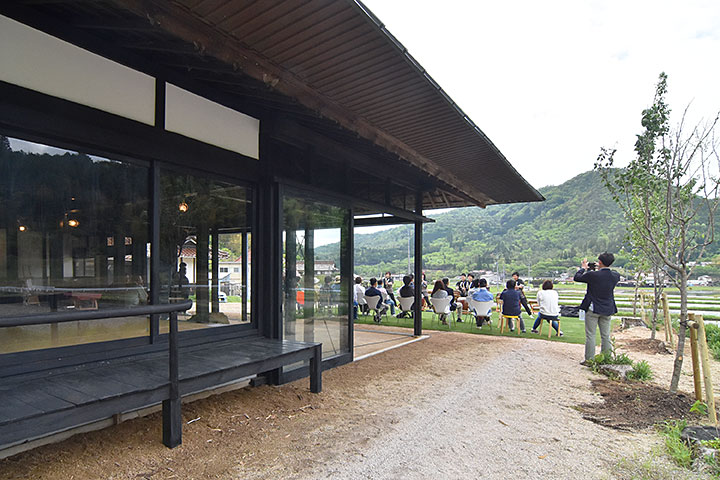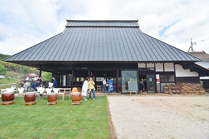 内陸の丘陵地に建つ、築100年級の古民家リノベーション。自然と調和した農村風景のただなかにある。近大工学部の谷川准教授が自ら購入し、ワークショップを重ねながらコミュニティ拠点としても使用できるよう改修した。