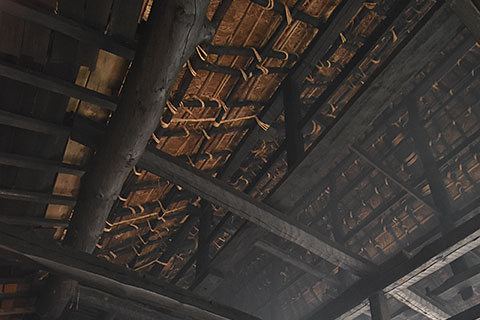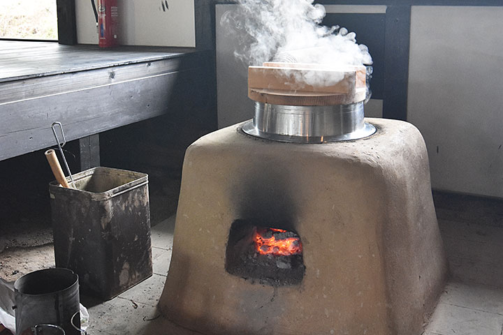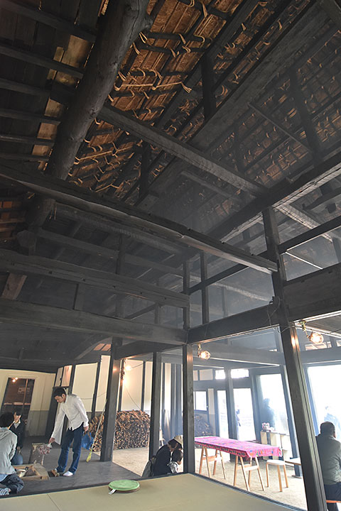 改修に着手する時点で既に茅葺屋根は金属で覆われていたが、この屋根は残すことにして、追加されていた材を撤去してスケルトン状態にする。そうするとしっかりした断熱は難しくなるので、居住性よりは開放性に振ったデザインに収れんしていった。すなわち、あえて土間を広げて外部との一体性を高め、大きなガラスが印象的な建具で空間を仕切っていく。建物の前面に広がる庭や、周囲のすばらしい眺望も借景にして取り込むことで、さらに開放性が高められている。