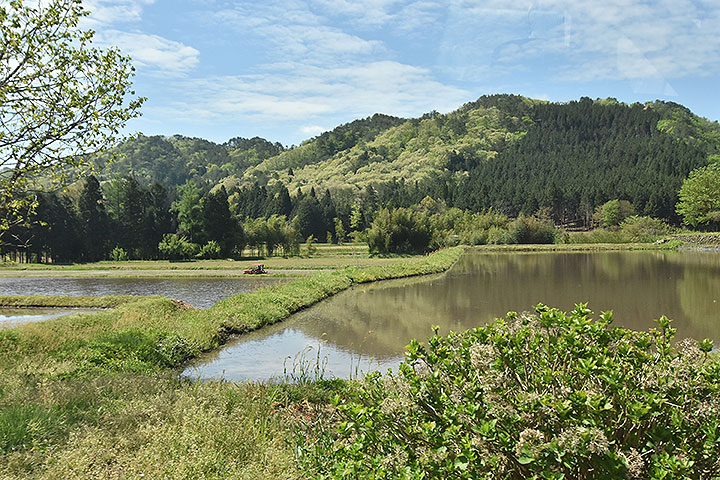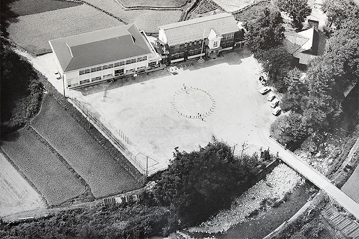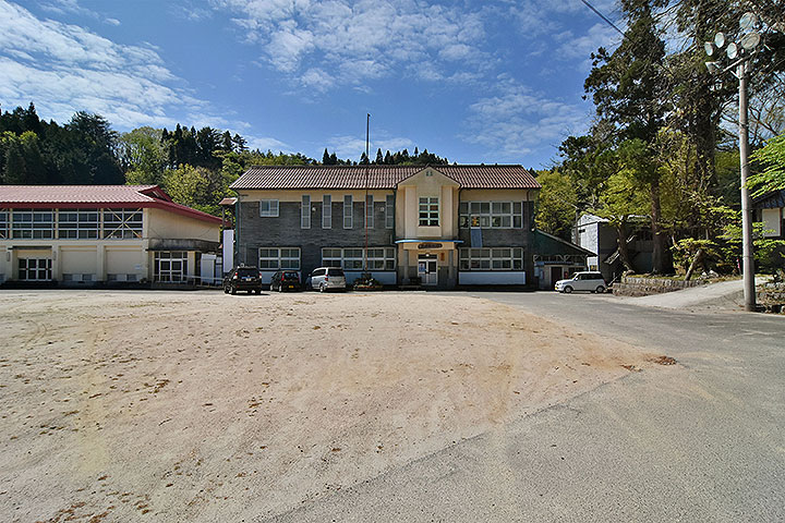北広島町の筏津という地域に残る旧木造校舎。周辺はまさに絵に描いたような里山の風景が広がっている。