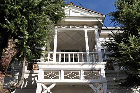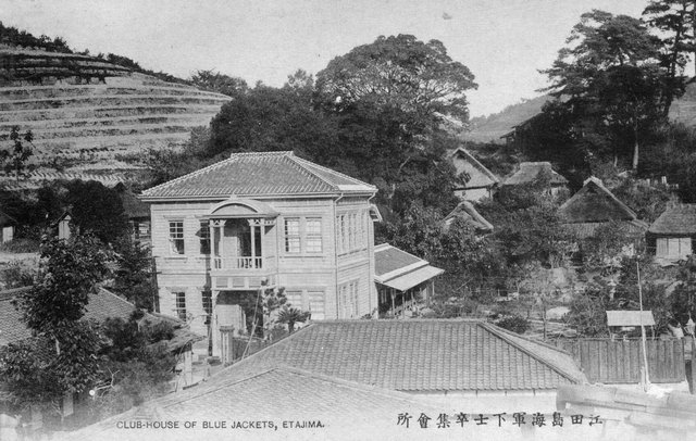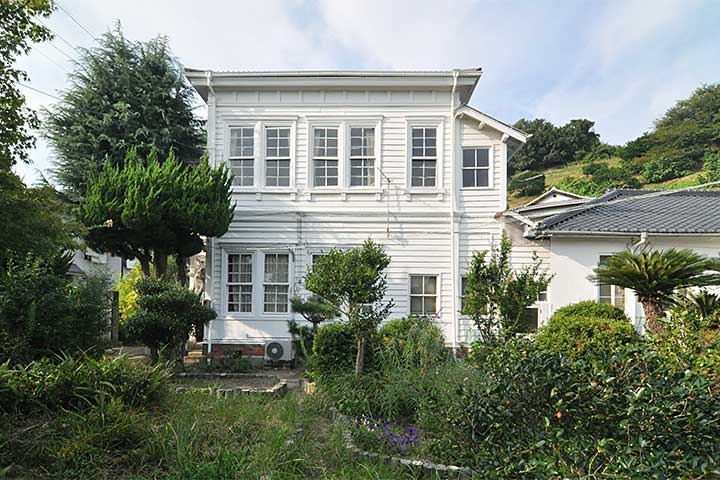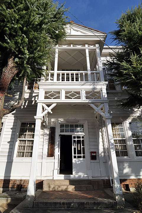 江田島に残る白い洋館。本作は、主に海軍兵学校の職員向けの福利厚生施設であり、遊戯場や浴場などを備えていた。後に兵学校の拡張にあわせて増築され、さらに収容力を増すために階段室が居室に変更されたために廊下に階段を付けるなど、やや強引な改造がなされている。