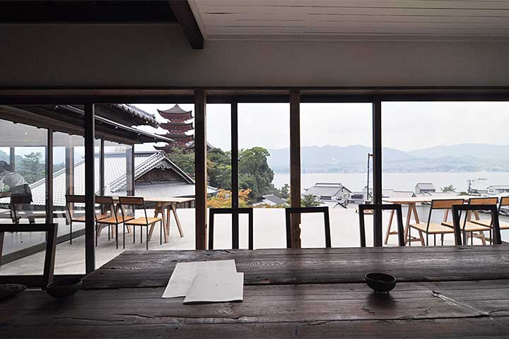 本作の特徴は、塔の岡を望む眺望を極限までシンプルに切り取るよう注力したところにある。西側は柱だけになり、屋外テラスと室内は段差が一切ないので、フルオープンにすることで、建物内外が完全に一体化する。塔の岡などは樹木が育ちすぎて視界を遮っているので、宮島でこれほどの開放感を伴う空間体験ができる場所は他にないように思う。