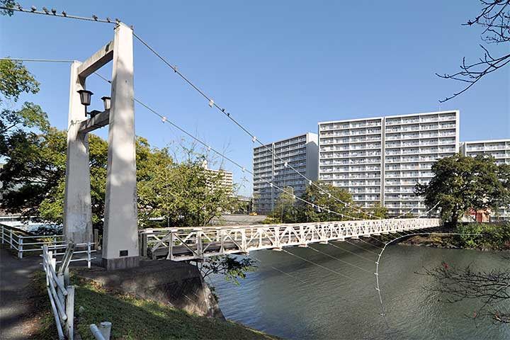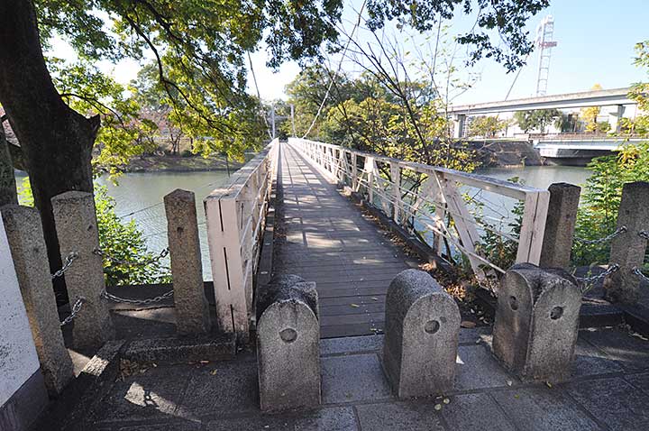 安田学園(かつての陸軍工兵第五連隊)横の河岸緑地から牛田方面に渡るための人道橋。初代の橋は工兵隊が北側の牛田演習場に行くため1889年に架橋、1933年に架け替えられ、現在の橋は三代目にあたる。