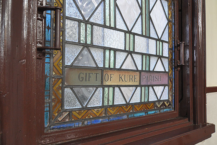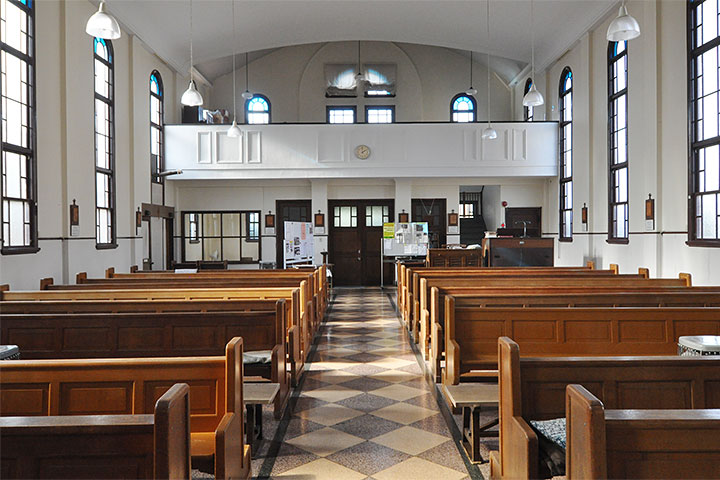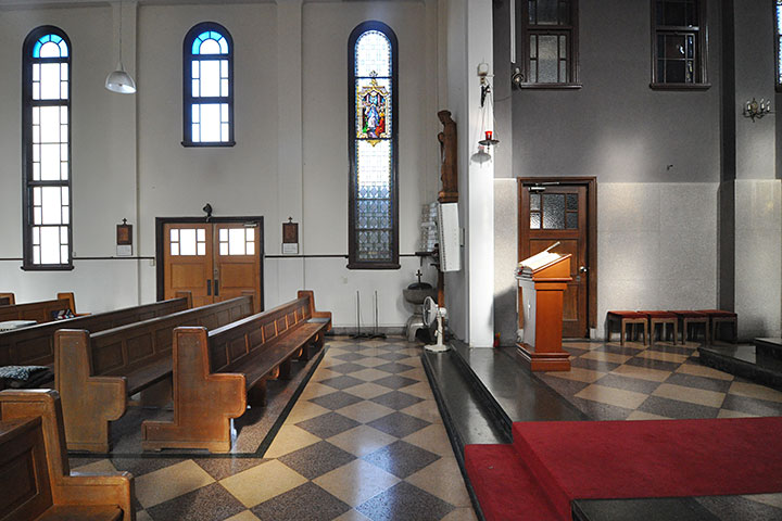 窓は当然のように縦長で、「上げ下げ窓」への強いこだわりが感じられるのも、本作への外国人の関与を示唆している。エントランス脇に付室または告解室と思われる空間があるが(写真#6)、畳敷と上げ下げ窓という和洋折衷だ。また、外国製と思われるステンドグラス(写真#5)や研ぎ出し仕上げの床(写真#4)も鑑賞に値する出来映えで、本作最大の見どころとなっている。
