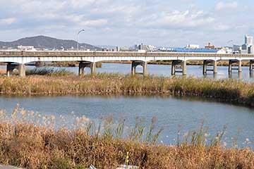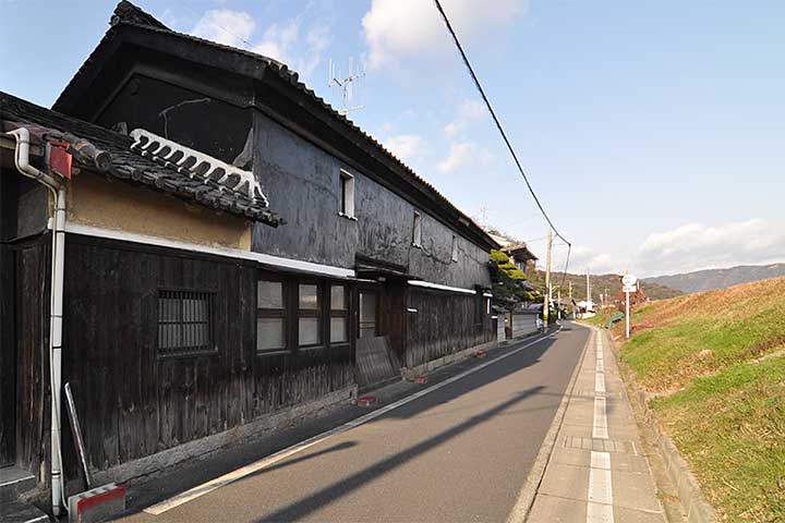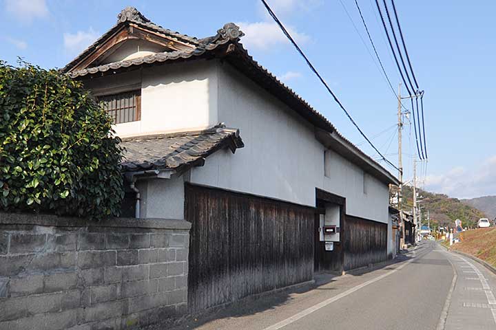 明王院から下流側、芦田川に沿った細長いエリアに長屋門が連なる一帯がある。形成経緯などはよく分かっていないので調査ししだい追記するが、黒漆喰に鎬桟瓦の名品があったり(写真#1)、立派な石造の基礎があったり(写真#2)、もっと有名になっていい逸品が並んでいる。また、この地域の重要な交通路である草戸大橋は1933年の架橋で、有数の近代化遺産である(写真#4)。
