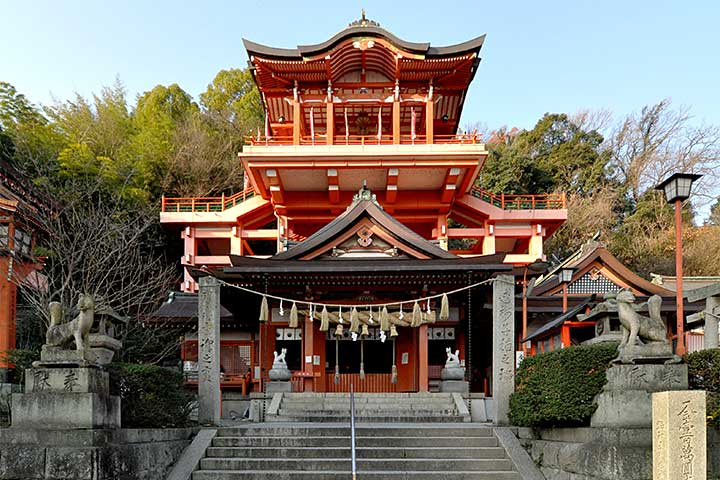 芦田川のほとり、崖下に建つ神社。福山での初詣の定番スポットだが普段は閑散としている。もともとは芦田川の中州にあったが、洪水被害等を避けてこの地に移転したという。