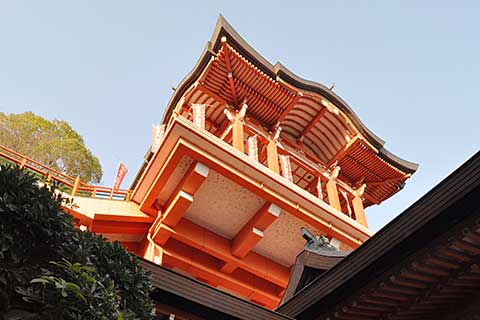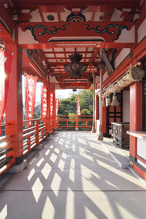 本作の特徴は、拝殿の上空にRCの構造物を組んで木造の本殿を載せたことに尽きる。もともとはセオリー通り拝殿の後ろに本殿があったというが、何らかの事情で建て替える際にスペースが無く、拝殿の頭上に載せたらしい。お世辞にも美しいとは言いがたいが、懸造のような独特な雰囲気を持つ建物だ。明王院とセットで行くといいだろう。