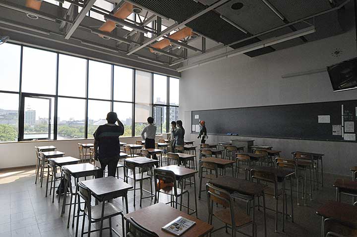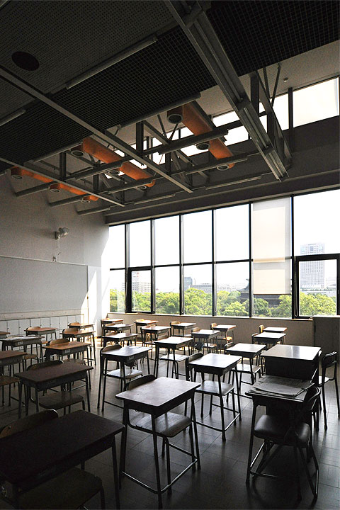 教室の天井は高く、それぞれ色彩などの変化が付けられており、大きな窓からは広島城を一望できる…のだが、窓はほとんど開かない。また、通常付くはずの庇がなく、室内のカーテンだけで日射を遮らねばならない。8月の夏休み期間に訪問した際には、その熱気に驚いた。これでは冷房をフル稼働させても厳しそうだ。