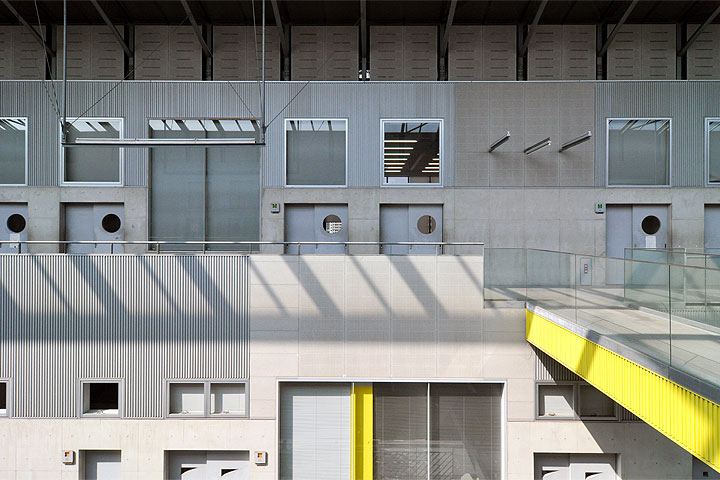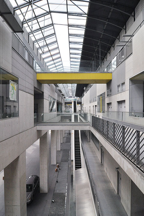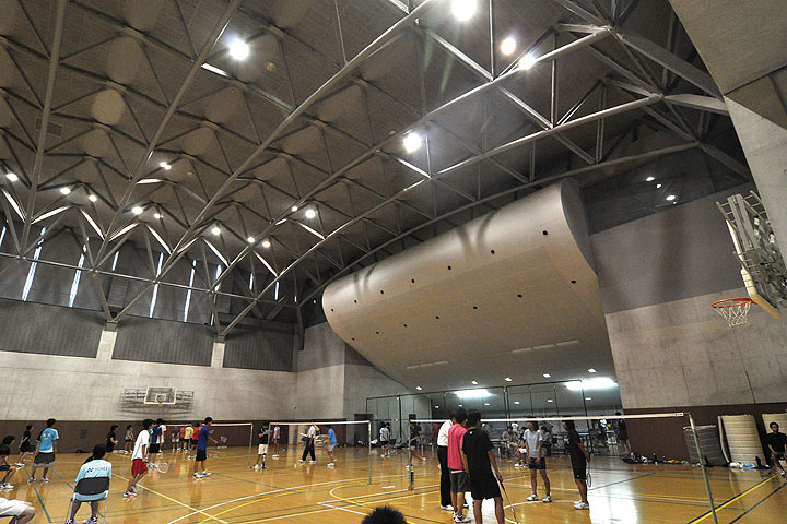 では、美術系ゾーンの下はどうなっているかというと、体育館と講堂がある。アーチトラスで33mスパンを飛ばしているのだが、上にそんなものが乗っているとは感じさせない軽快な表現となっている(写真#9)。
