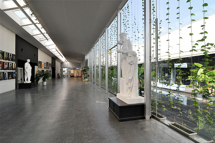 基町高校は公立ながら充実した美術コースで知られており、この西棟の上階には西洋画、日本画、CG、陶芸などのアトリエがまとめて配置され、先ほどの普通教室ゾーンと渡り廊下で行き来できる。共用廊下は広く、ギャラリーとしても機能するよう設計されており(写真#8)、中庭も設けられている(写真#14)。