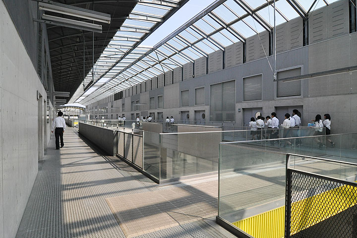 低層部がコンクリートのマッシブな(量感のある)表現であるのに対し、4階は鉄とガラスの軽快な表現となっている。前述の通り共用廊下は外部空間であり、風雨のある日は教室間移動にも苦労が伴う。