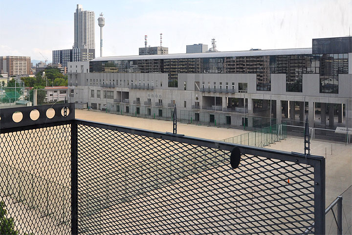 南棟では、前面道路への圧迫感を和らげるために1~2階の一部を吹きさらしのピロティとしており、グラウンドから広島城のグリーンへ視界が通る。(写真#1)