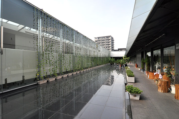 そのエスカレーターのある吹抜け空間は外部であり空調されていないばかりか、屋根も部分的に付いているのみであり、雨天時にエスカレーターに乗ると濡れてしまう。エスカレーターを少し奥へ動かすだけで濡れずに済むのだが、この設計意図はどこにあるのだろうか…?(写真#4)