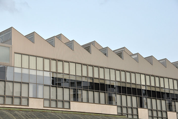 自然光といっても直射日光では強すぎるので、各アトリエの天井には北向きのハイサイドライトが配されている(写真#16)。西棟がノコギリ屋根なのはこのためだ(写真#17)。
