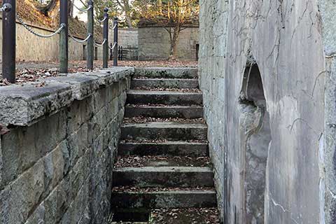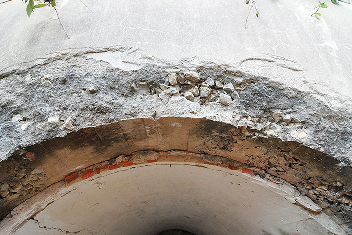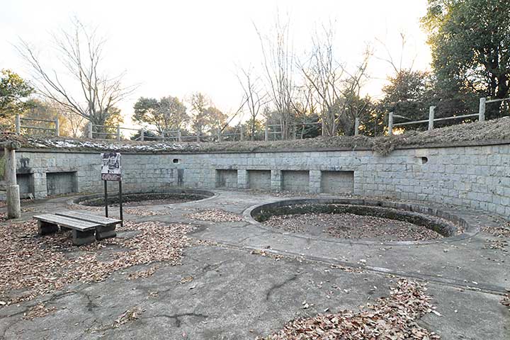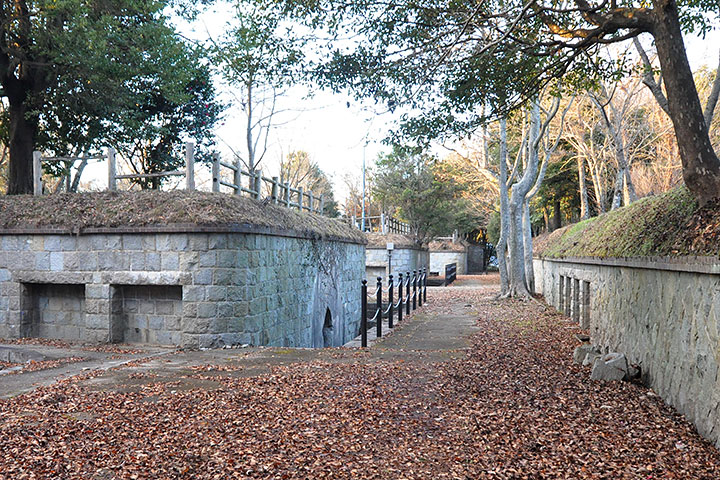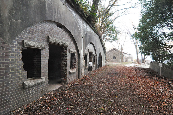 デザインは同時期に建設された他の砲台と同様。当時はRCの技術が普及しておらず、もっぱら石やレンガ(現地案内板によると播州煉瓦という)が使用された。コンクリートも見られるがおそらく無筋と思われ、組積造と同じ要領でアーチにして加重を受けている。上に被せた土はカムフラージュと敵弾避けを兼ねたものだろう。なお室内は湿度維持の役割も兼ねて漆喰仕上げとなっている。