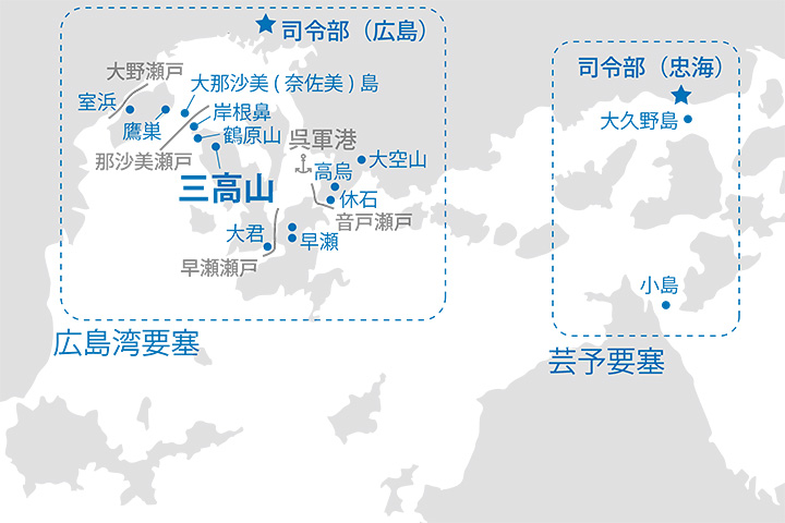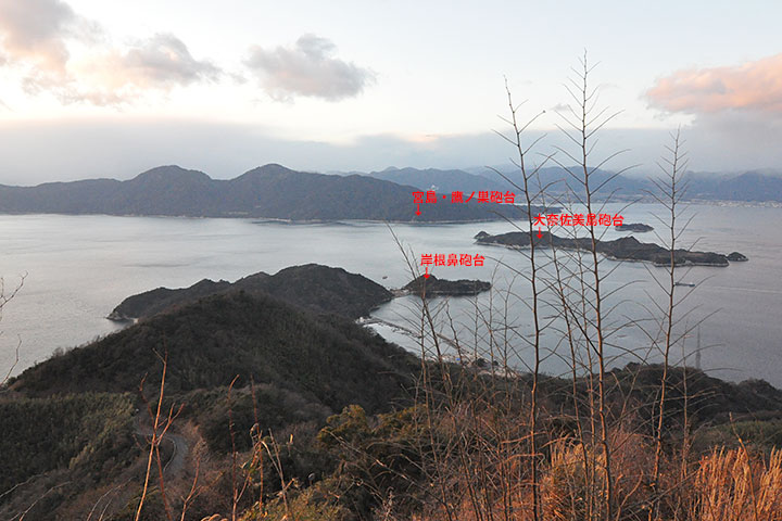 日露戦争直前に建設された広島湾要塞における最大規模の砲台跡。現在は公園として整備されている。広島・呉へ向かう大型船の航路は那沙美瀬戸に限られるため、海峡沿いの三高山、大奈佐美島、岸根鼻、鶴原山、鷹巣に砲台が築かれ、十字砲火を形成してロシア艦隊に対抗することが意図されていた。もっとも、日露戦争の経過はよく知られた通りであり、これら砲台群は実戦を経験することなく廃止された。