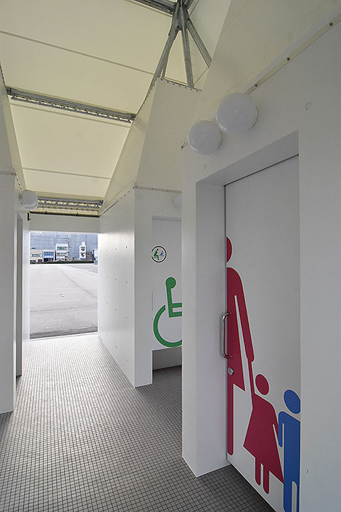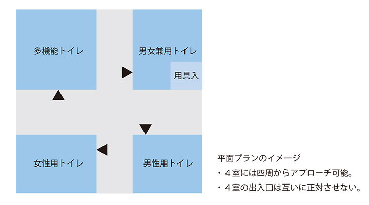 平面プランもシンプルながら示唆に富んだものだ。正方形を田の字に分割し、男用・女用・兼用・身障者用の4室を設け、四周いずれからも4室にアプローチできる。どこまで設計で意図されたのかは分からないが、入口では男女を区別しないことで、子連れやトランスジェンダーへの平等感も高いように感じられた。