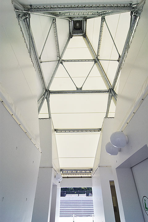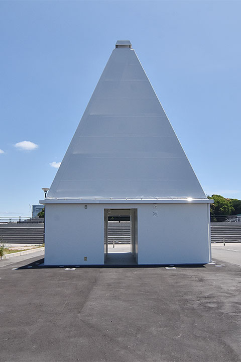 そこで、海を思わせ動線の道しるべとなる「灯台」をコンセプトに据え、背の高い屋根を付ける形態となった。この屋根はテント地?になっており、昼間は外光を柔らかく取り入れ、夜間は照明により屋根全体が光って広場の行燈となる。