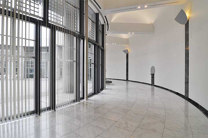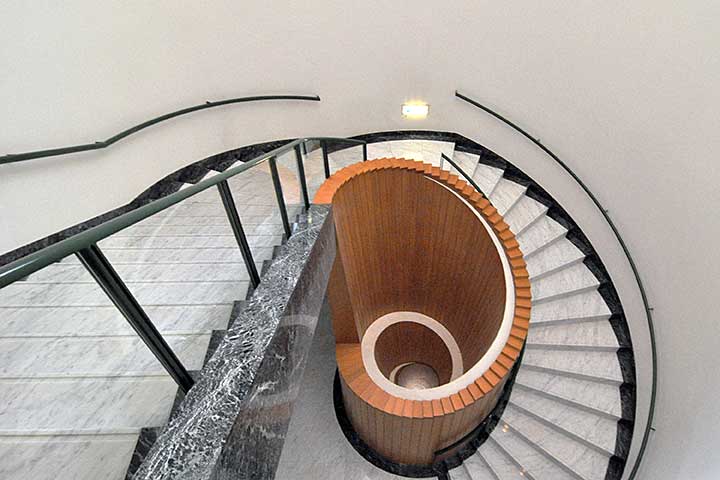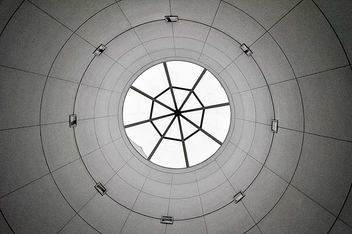 この造形が美しいかと問われると答えに窮するが、どうしようもないポストモダン駄作と比べれば、一応は建築作品として鑑賞に耐える。