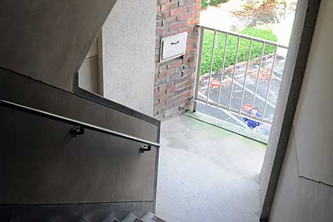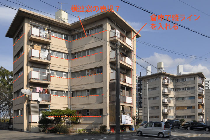 スターハウスは標準設計に基づいて全国各地に建てられたが、完全に同じ設計ではなく、それぞれ個性がある。本作にははっきりした個性があり、水平連続窓や倉庫ボリュームの連続などタテ・ヨコのラインをきれいに揃えている点が外観上の特徴である(写真#3)。ここまでラインを整えているスターハウスは珍しい。さすがはモダニズム建築の宝庫、広島らしいと感じるのは私だけだろうか。